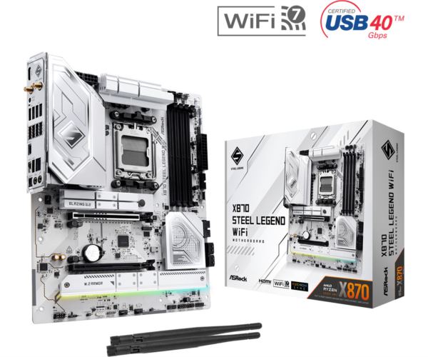 Asrock AMD AM5 X870 STEEL LEGEND WIFI – Supports AMD Ryzen 9000, 8000 and 7000 Series Processors 14 2 1 Phase Power Design, 80A Dr.MOS for VCore SOC 4 x DDR5 DIMMs Supports Dual Channel, up to 8000 (OC) 1 PCIe 5.0 x16, 1 PCIe 4.0 x16 Graphics Output Options: 2 USB4 Type-C, 1 HDMI Realtek ALC4082 7.1 CH HD Audio Codec, Nahimic Audio 1 Blazing M.2 (PCIe Gen5x4), 2 Hyper M.2 (PCIe Gen4x4), 4 SATA3 2 USB4 Type-C (Rear), 1 USB 3.2 Gen2x2 Type-C (Front), 2 USB 3.2 Gen2 Type-A (Rear), 7 USB 3.2 Gen1 (3 Rear, 4 Front), 8 USB 2.0 (4 Rear, 4 Front) Realtek 2.5G LAN 802.11be Wi-Fi 7 Bluetooth Supports Toolless Multi-Layer M.2 Heatsink, M.2 Bottom Heatsink