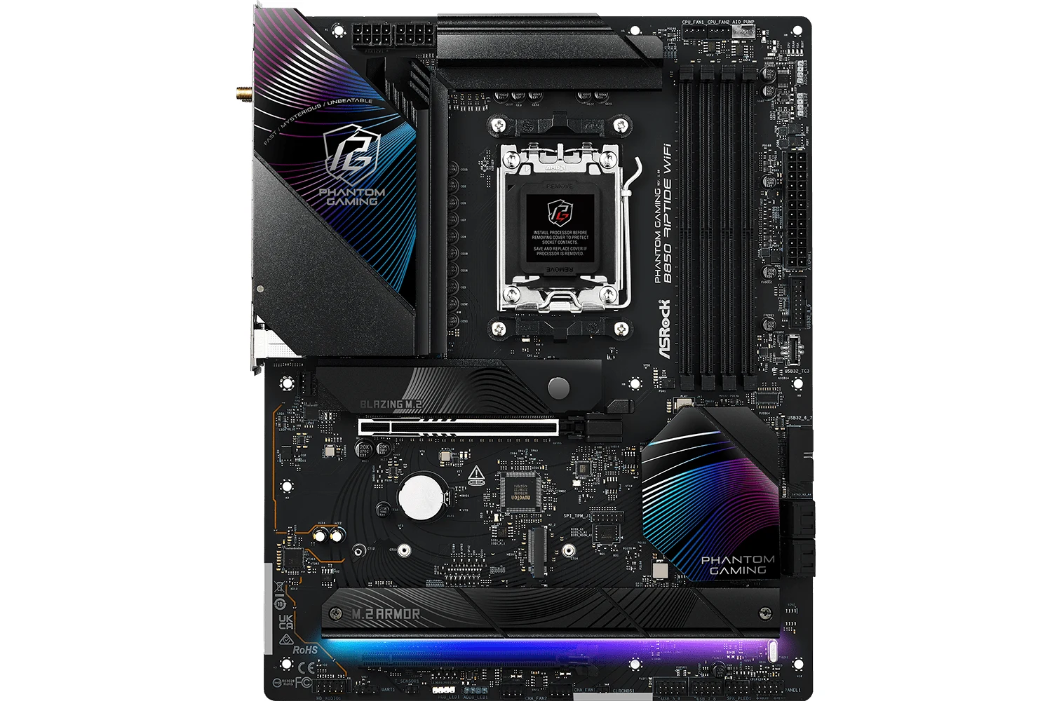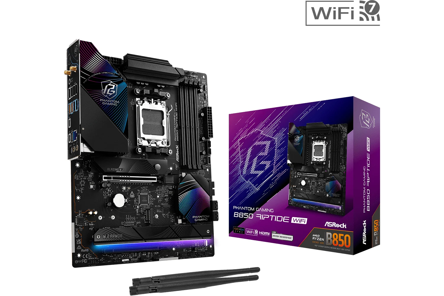 ASRock Phantom Gaming B850 Riptide WiFi je matična ploča dizajnirana za entuzijaste i igrače koji traže visokokvalitetne performanse i stabilnost. Opremljena AMD B850 čipsetom, podržava najnovije AMD Ryzen™ 7000, 8000 i 9000 serije procesora na AM5 socketu.