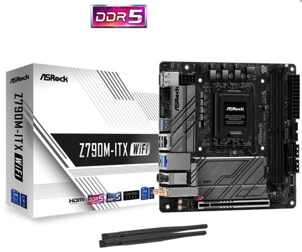 Asrock Intel LGA1700 Z790M-ITX WIFI – Supports 13th Gen 12th Gen and next gen Intel Core Processors 7 1 1 Phase Power Design, Dr.MOS for VCore GT 2 x DDR5 DIMMs, supports up to 7000 (OC) 1 PCIe 5.0 x16 Graphics Output Options: 1 HDMI, 1 DisplayPort, eDP 7.1 CH HD Audio (Realtek ALC897 Audio Codec), Nahimic Audio 1 Hyper M.2 (PCIe Gen4x4), 1 Hyper M.2 (PCIe Gen4x4 SATA3), 4 SATA3 1 USB 3.2 Gen2x2 Type-C (Front), 1 USB 3.2 Gen2x2 Type-C (Rear), 4 USB 3.2 Gen2 Type-A (Rear), 2 USB 3.2 Gen1 (Front), 3 USB 2.0 (1 Rear, 2 Front) Intel 2.5G LAN, Intel 1G LAN 802.11ax Wi-Fi 6E Bluetooth 5.3