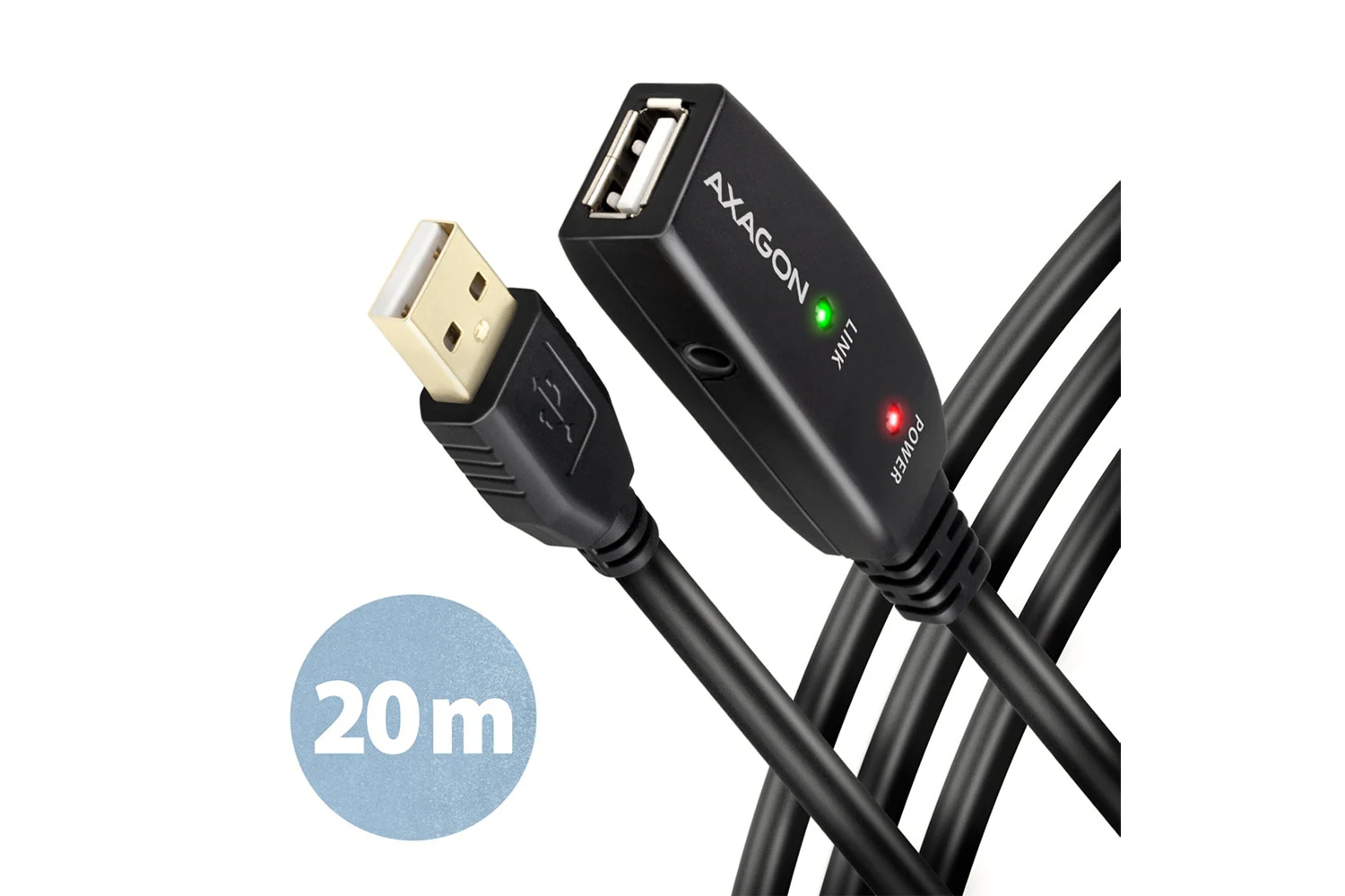 Active extension AXAGON ADR-220 USB 2.0 cable, 20 m long is ideal for connecting your computer to a USB device such as a mouse, keyboard, webcam, printer, scanner, plotter and others. The active USB repeater cable strengthens the passing signal and allows you to connect a significantly more distant USB device than the usual passive cable. The range of the cable can be further extended by using several cables in a row.