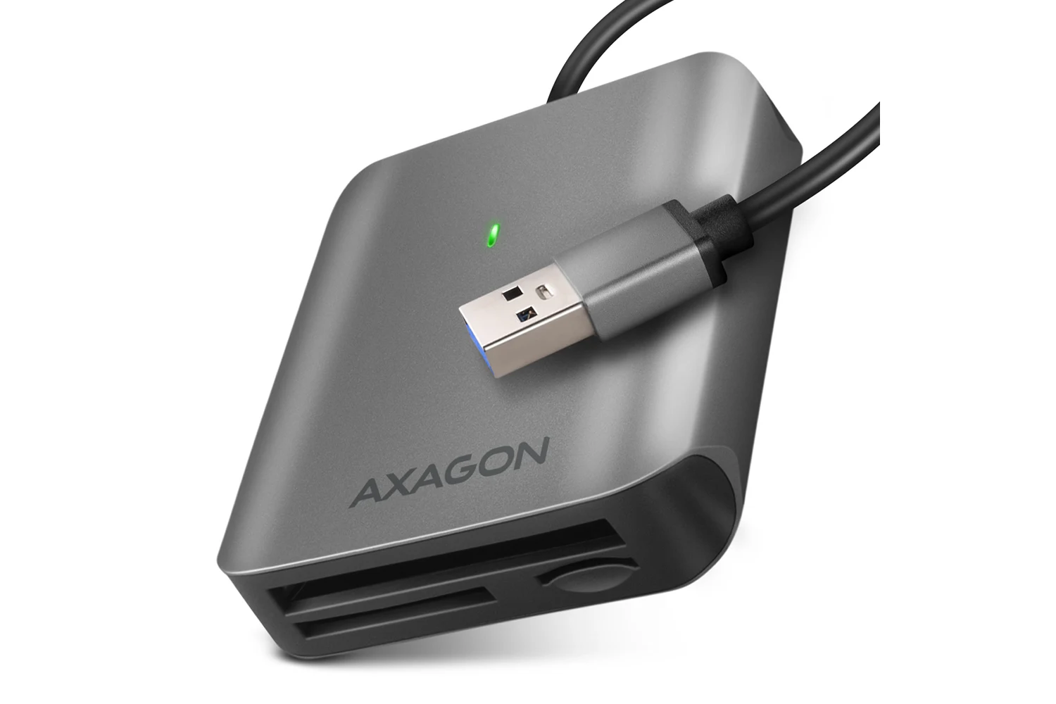 Aluminijski 3u1 čitač memorijskih kartica AXAGON CRE-S3 SUPERSPEED s USB 3.2 Gen 1 sučeljem podržava sve trenutne verzije SD i microSD kartica uključujući SDXC i microSDXC s kapacitetima do 2TB. Također podržava CF kartice s kapacitetima do 128PT. Zahvaljujući USB 3.2 Gen 1 (prije USB 3.0) sučelji, čitač postiže značajno veće brzine prijenosa u usporedbi s čitačima s USB 2.0 sučeljem. UHS-II kartice dostižu brzine do 156 MB/s (puni duplex) ili 312 MB/s (pola duplexa), podrška za starije USH-I kartice (maksimalna brzina 104 MB/s) je također podržana.