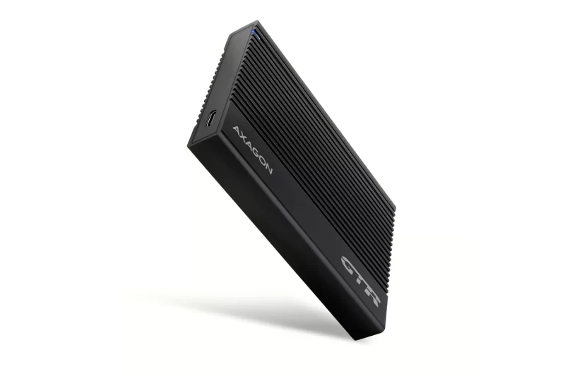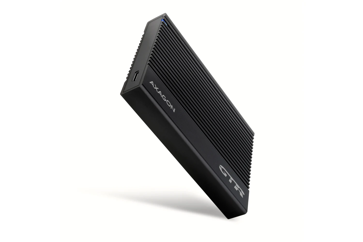 Ribbed aluminum external AXAGON EE25-GTR RIBBED box with USB 3.2 Gen2 interface for 2.5” SATA HDD or SSD. The double-sided USB-C connector on the box together with the supplied USB-C -> USB-A cable and USB-A -> USB-C adapter enables a reliable connection to a computer.