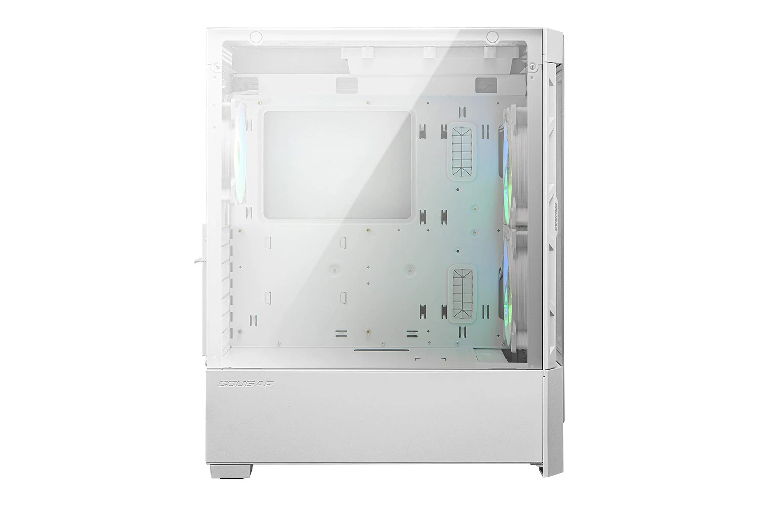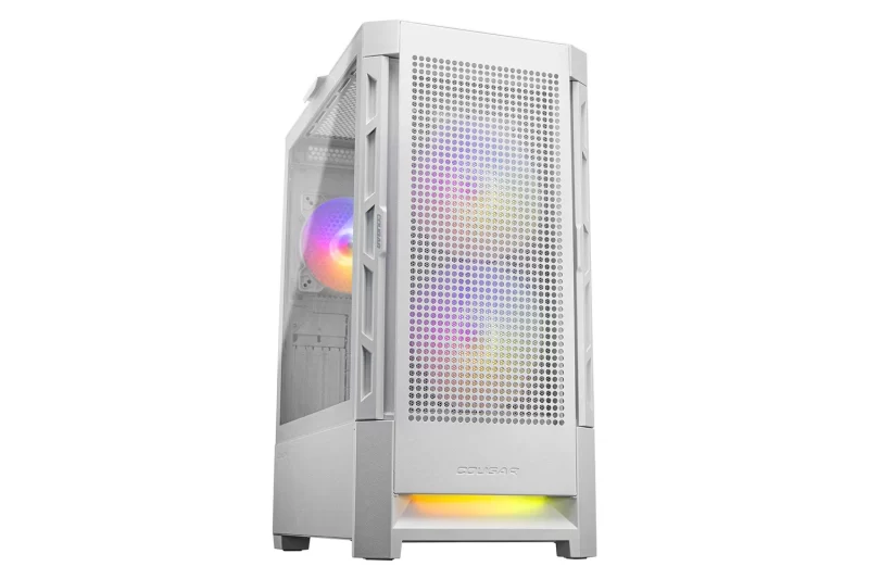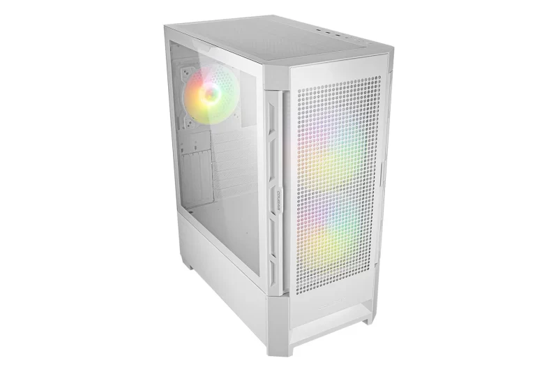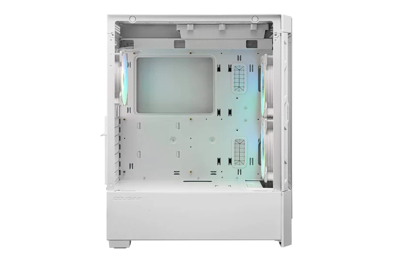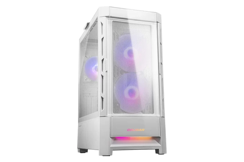 Vizualna privlačnost ovog kućišta dodatno je naglašena prisustvom tri adresabilna RGB ventilatora – dvama 140 mm ventilatorima sprijeda te jednim 120 mm ventilatorom straga, a istaknuti COUGAR logo s pozadinskim osvjetljenjem dodaje završni estetski detalj. RGB sustav može se kontrolirati putem posebnog RGB gumba na kućištu, a moguće ga je sinkronizirati i s matičnom pločom zahvaljujući kompatibilnosti s 5V ARGB priključcima, čime se postiže jedinstvena rasvjeta cijelog sustava.