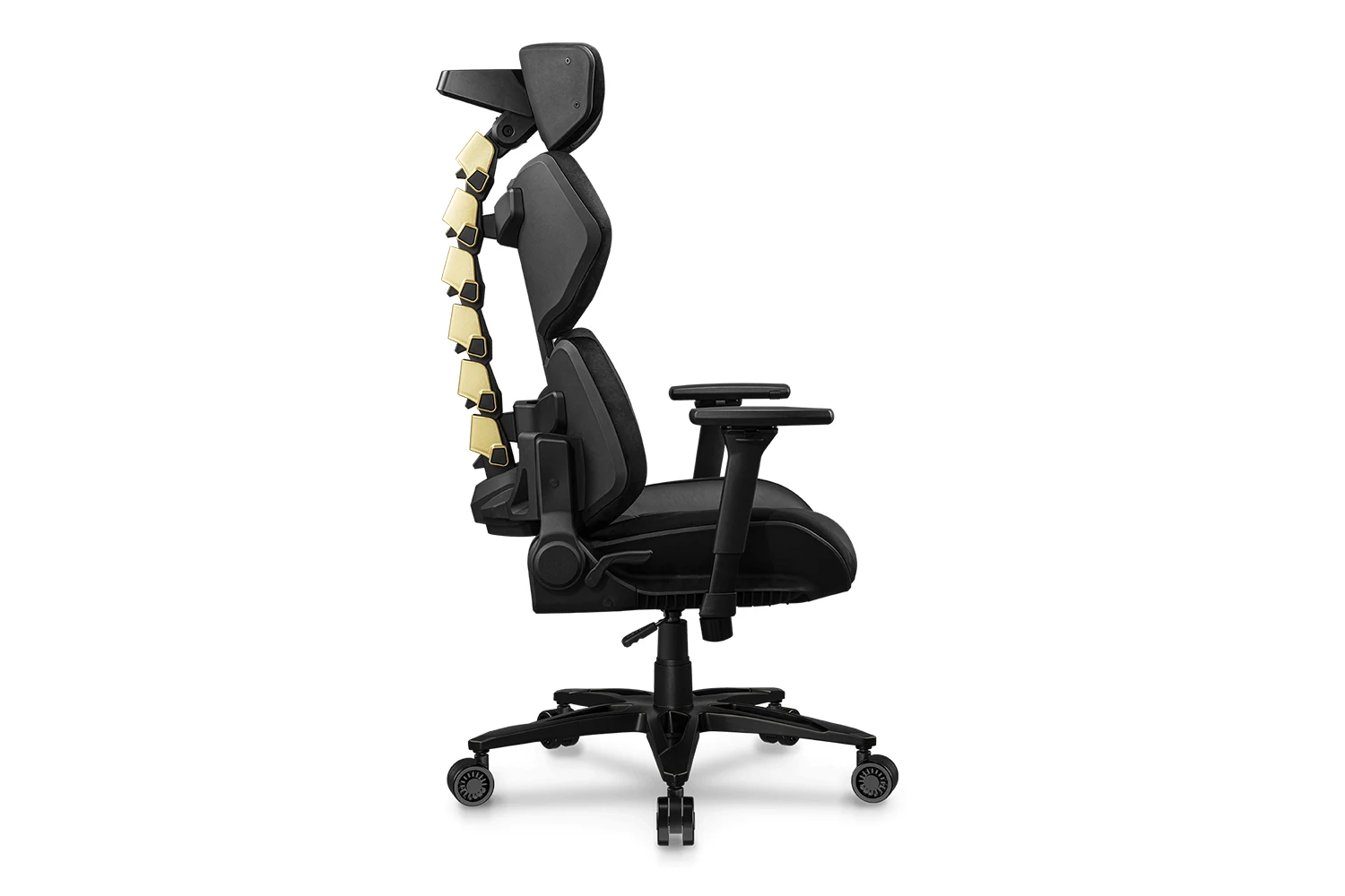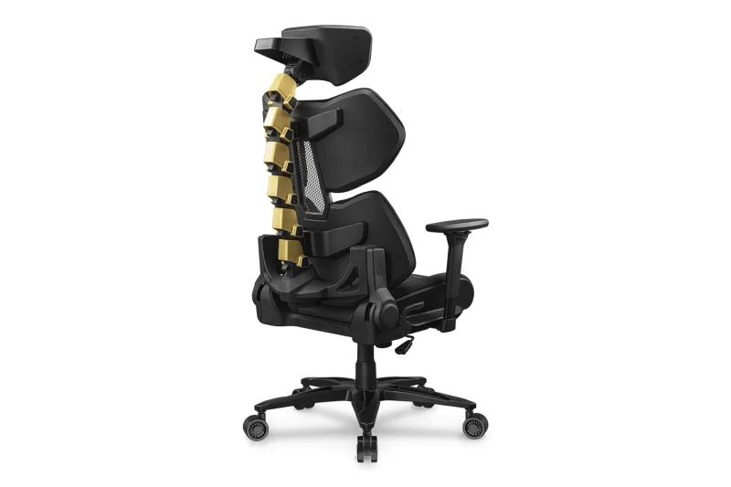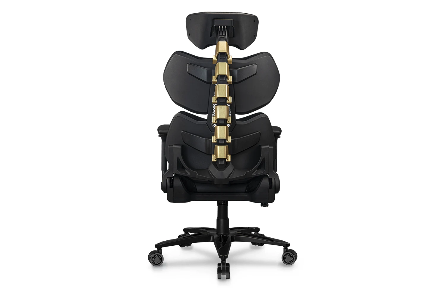 Pri prvom pogledu, odmah se ističe njegova jedinstvena stražnja konstrukcija – tzv. “Druga kralježnica”, izrađena u sjajnoj metalik zlatnoj ili srebrnoj varijanti koja ne samo da privlači poglede, već i anatomski prati prirodnu krivulju leđa. To omogućava optimalnu potporu i smanjuje naprezanje u donjem dijelu leđa, što posebno dolazi do izražaja tijekom dugih gaming ili radnih sesija .
