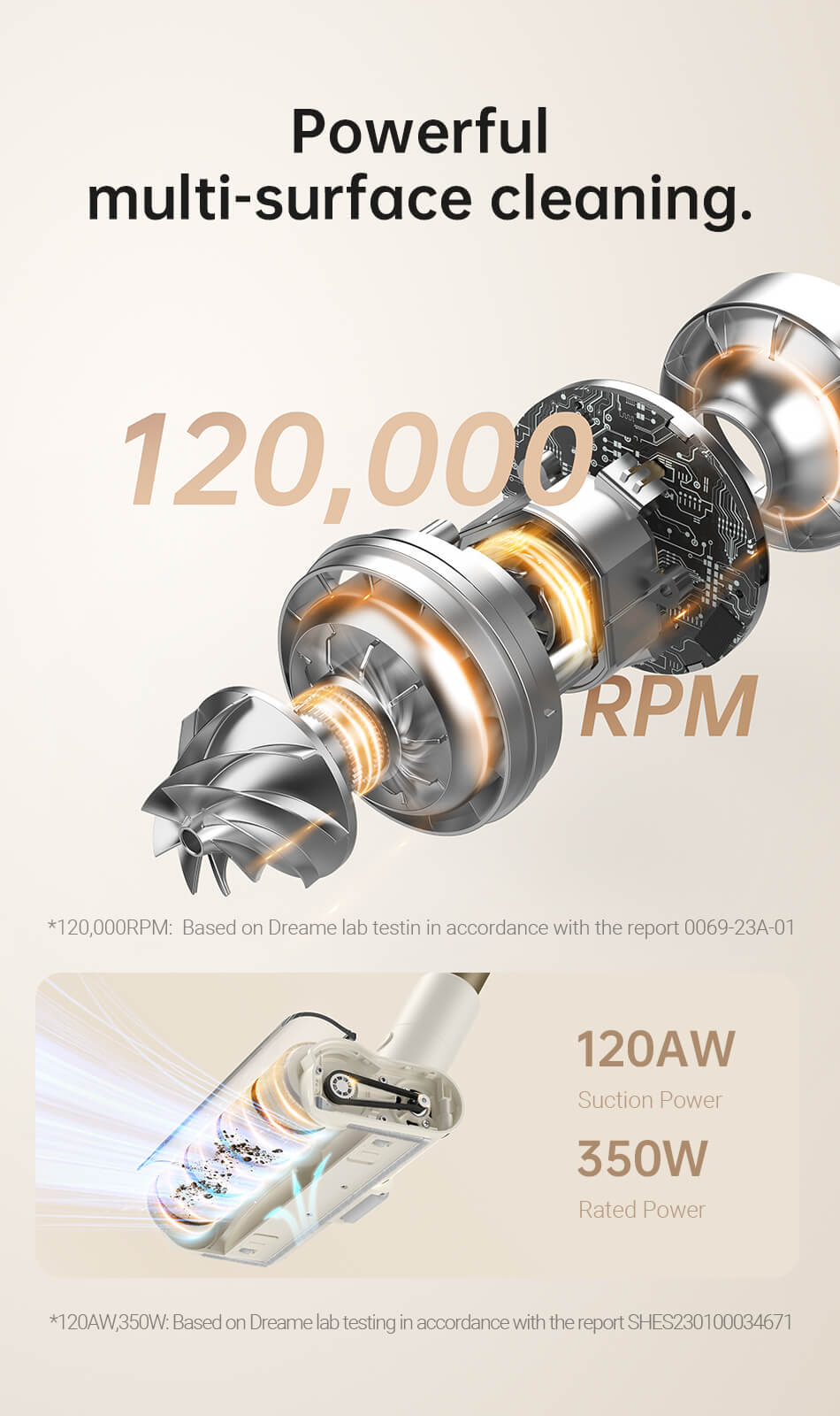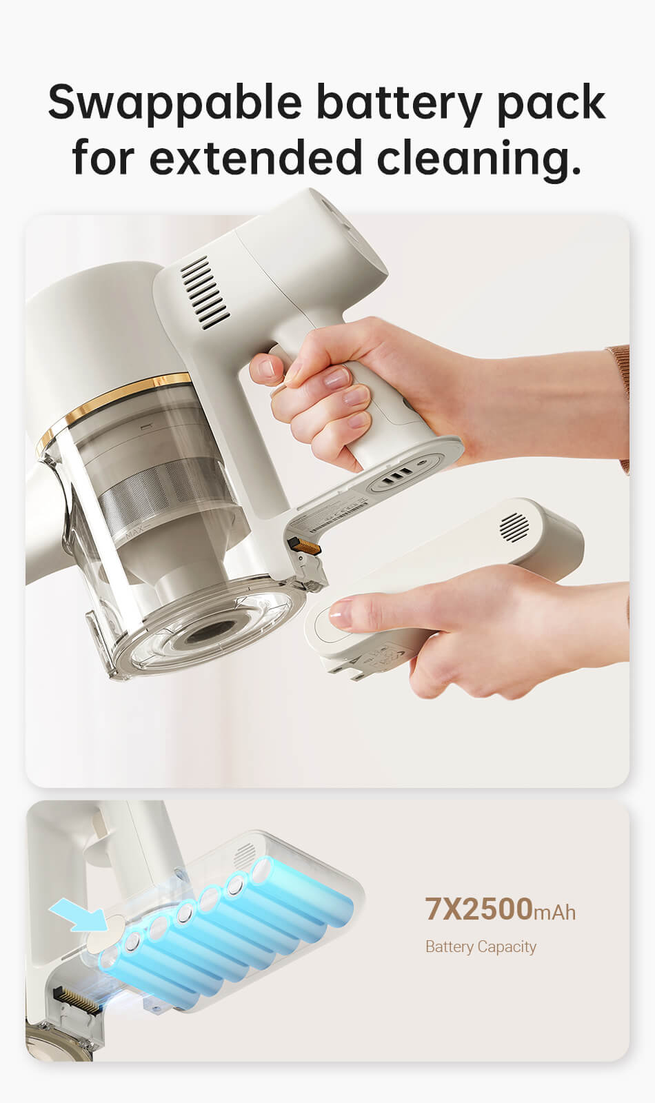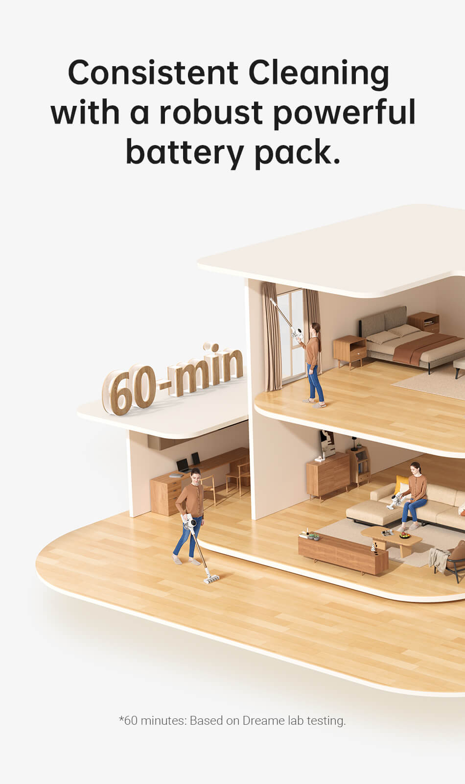 - Kontinuirano i snažno čišćenje – Uživajte u do 60 minuta bežičnog čišćenja uz stalnu, snažnu snagu usisavanja. Očistite cijeli dom s 120 AW (20000 Pa) usisnom snagom zahvaljujući 7×2500 mAh bateriji i brzom 12000 RPM motoru bez četkica za čišćenje .