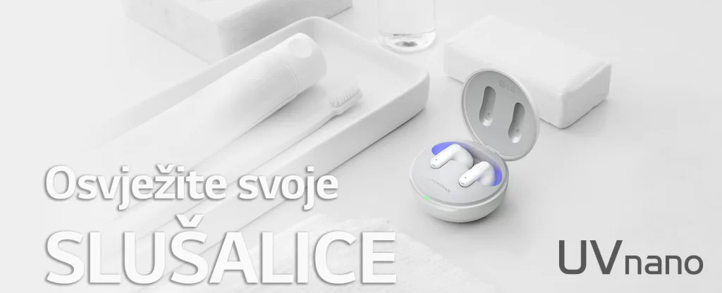 LG TONE Free jedine su UV slušalice u koje se možete pouzdati. Ako ste zabrinuti za higijenu i čistite slušalice alkoholom, mogli biste oštetiti područje mrežice. Uz TONE Free možete jednostavno staviti slušalice u kutijicu da se napune – spojene ili bežično – a UVnano ubija 99,9 % bakterija u samo 5 minuta.