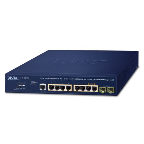 Planet GS-4210-8HP2S, IPv6 IPv4, 2-Port 10 100 1000T 802.3bt 60W PoE 6-Port 10 100 1000T 802.3at PoE 2-Port 100 1000X SFP Managed Switch(240W PoE Budget, 250m Extend mode and cybersecurity features). Ports 1 to 6 support up to 36 watts, Ports 7 to 8 support up to 95 watts