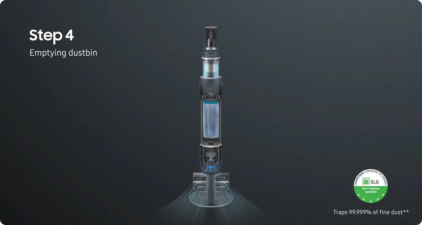 Uživajte u jednostavnom pražnjenju spremnika i punjenju baterije usisavača. Multifunkcionalna postaja za čišćenje Clean Station učinkovito* prazni spremnik za prašinu od prljavštine i dlaka kućnih ljubimaca primjenom tehnologije „Air Pulse” dok se baterija istodobno puni. Osim toga, hvata 99,999 % sitnih čestica prašine**, dok antibakterijska vrećica za prašinu sprečava rast 99,9 % bakterija***.