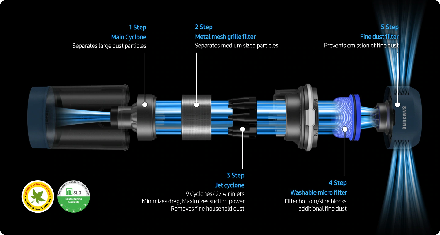 Hvata 99,999 %* čestica prašine** i smanjuje izloženost alergenima kućnih ljubimaca*** zahvaljujući 99,999 %-tnoj učinkovitosti višeslojnog sustava za filtraciju. Glavni ciklon i filtar s metalnom mrežastom rešetkom sakupljaju velike čestice prašine. Mlazni ciklon i mikrofiltar potom hvataju sitne čestice prašine, a filtar za sitne čestice prašine zadržava mikročestice prašine**.