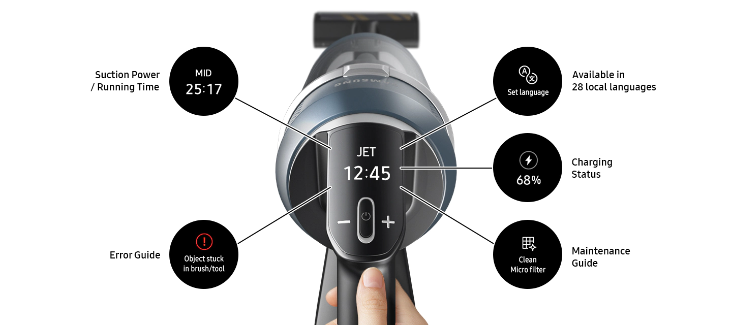 Ručno provjerite da je sve spremno za pokret. Jednim pogledom vidjet ćete što Vam je potrebno na LCD digitalnom zaslonu. Provjerite kojom se razinom usisa koristite, koliko je ostalo napunjenosti* i dobivajte čak i upozorenja za rješavanje problema.