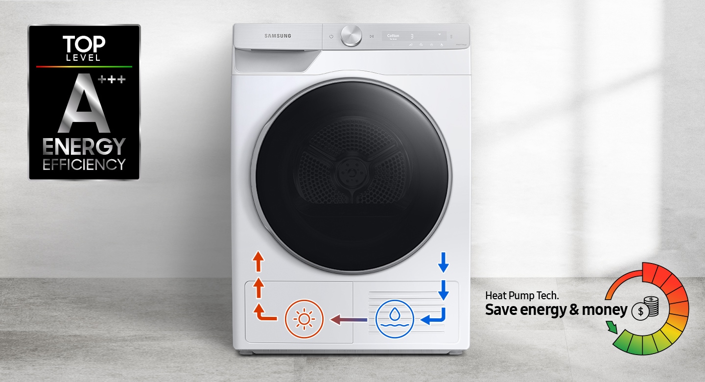 Uštedite novac i štitite okoliš trošeći manje električne energije*. Tehnologija toplinske crpke nudi Vam energetski učinkovitiji, isplativiji i nježniji način sušenja Vaše odjeće. Riječ je o A+++ energetskom razredu jer za zagrijavanje zraka upotrebljava „rashladno sredstvo“ i reciklira zrak kako bi se izbjeglo rasipanje energije.