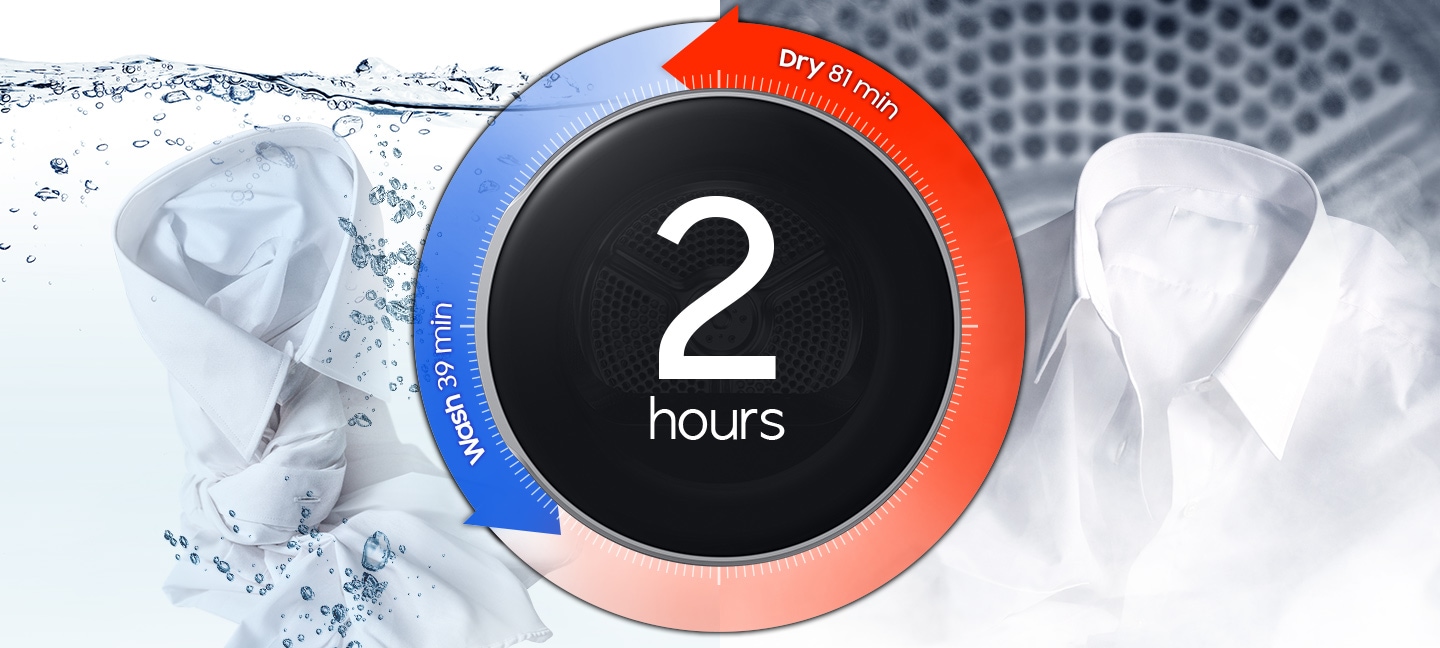 Očistite odjeću i pripremite je za nošenje u samo dva sata, uz uštedu energije. Ciklus Superbrzina mješovito punjenje odjevnih predmeta od pamuka i sintetike može osušiti za 81 minutu*. A uz perilicu s funkcijom Superbrzina, odjeću možete oprati i centrifugirati za ukupno 39 minuta*. Tako odjeća može biti oprana i osušena za 2 sata.