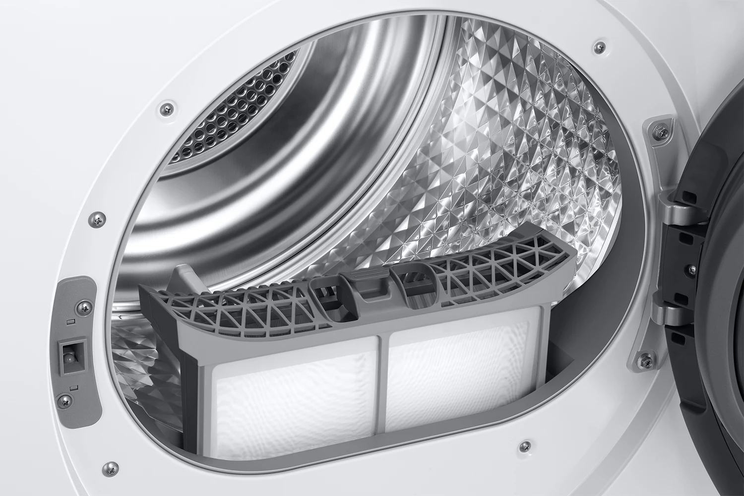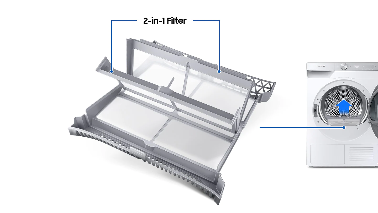 Omogućuje Vam lakše održavanje Vaše sušilice uz optimizaciju učinkovitosti i sigurnosti sušenja. Inovativni 2 u 1 filtar odlikuje se dvoslojnom mrežicom. Stoga nije potreban filtar na izmjenjivaču topline, što olakšava njegovo održavanje. Dva će Vas zvučna upozorenja podsjetiti kada je potrebno očistiti filtar i izmjenjivač topline.