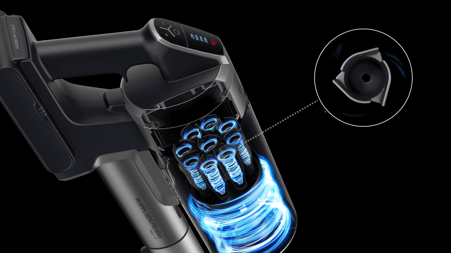 Visoka učinkovitost multiciklonske tehnologije koju primjenjuje sustav mlaznog ciklona omogućuje Vam da uživate u boljem pročišćivanju zraka i izvanrednoj usisnoj snazi. Optimalni protok smanjuje otpor zraka, a njegovih 9 ciklona s 27 ulaza zraka smanjuje gubitak usisne snage. Također usisava i sitne čestice prašine zadržavajući ih u unutrašnjosti.