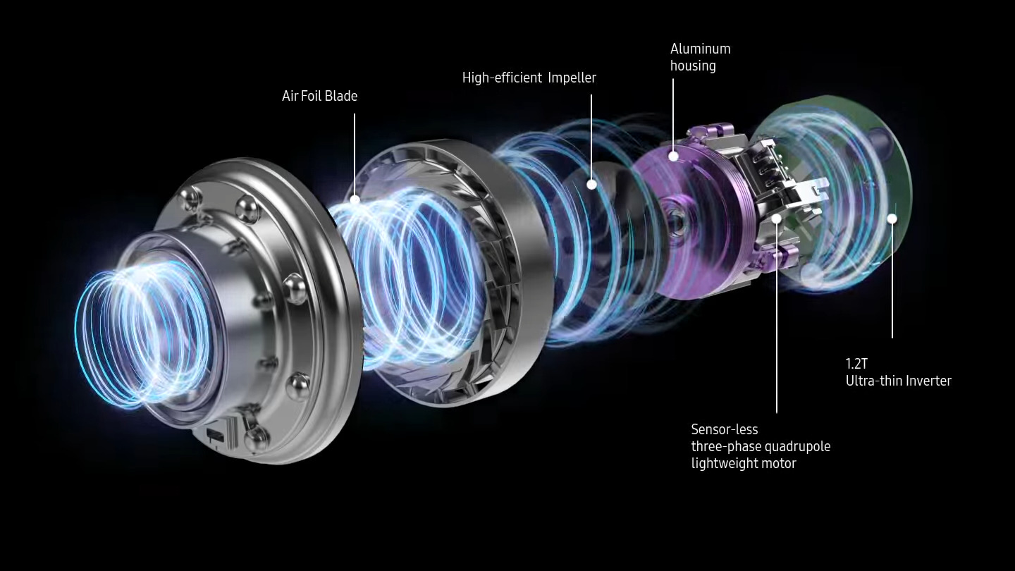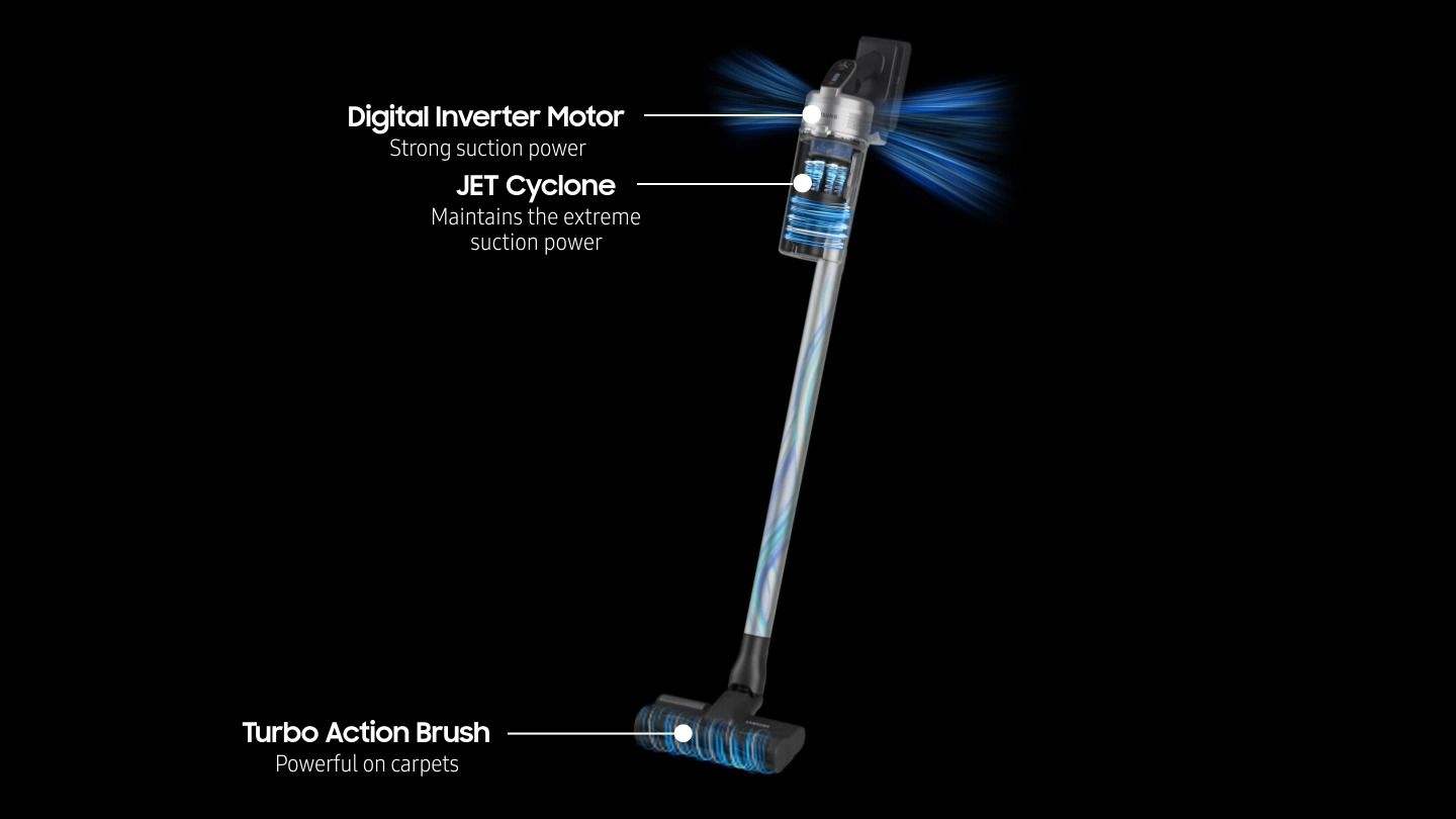 Očistite različite vrste podova s maksimalnom usisnom snagom. Samsungov Motor s tehnologijom digitalnog pretvarača usisava snagom do 200 W*. Aerodinamičan dizajn ventilacijskog sustava, od četke do filtra, optimizira protok zraka, dok multiciklonski sustav filtracije zadržava sitne čestice prašine.