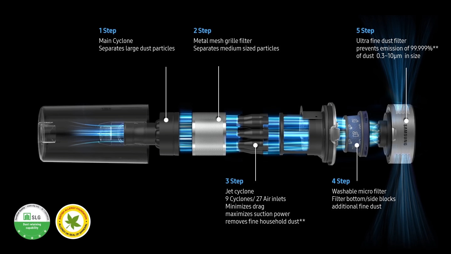 Otpušta čist zrak zahvaljujući peteroslojnom HEPA filtracijskom sustavu*. Dok zrak ulazi, glavni ciklon i filtar s metalnom mrežastom rešetkom sakupljaju velike čestice prašine. Mlazni ciklon i mikrofiltar hvataju sitne čestice prašine, a filtar za ultrasitne čestice prašine zadržava 99,999 %** mikro čestica prašine, uključujući čestice i alergene raspona veličine 0,3~10 µm***.