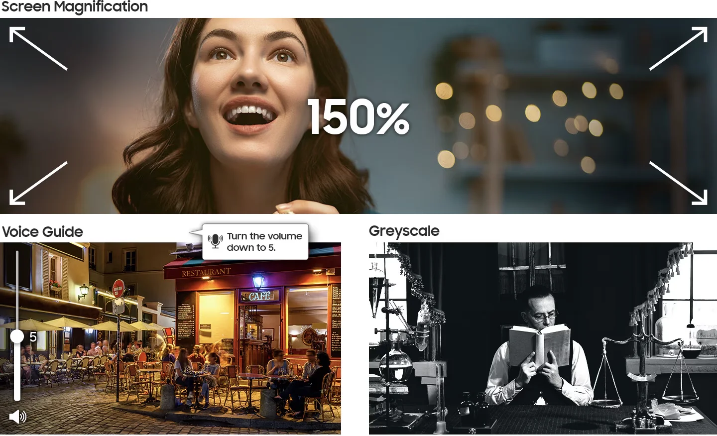 Pri dizajniranju našeg Smart Monitor uređaja mislili smo na pristupačnost, posebno za korisnike sa slabijim osjetilom vida. Monitor je opremljen alatima koji im pomažu da bolje vide i lakše upotrebljavaju zaslon, a među alatima se nalaze zamjena palete boja te zvučni opisi postavki TV-a poput onih za mijenjanje glasnoće i kanala.