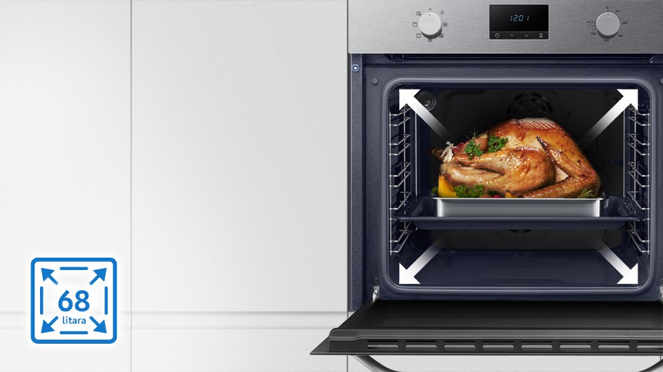Ogroman kapacitet od 68 l pruža više fleksibilnosti. U slučaju obiteljskih okupljanja ili zabava možete pripremati više jela odjednom (primjerice, kolačiće ili jela iz pekača) ili pak peći i veća jela, primjerice blagdansku puricu.