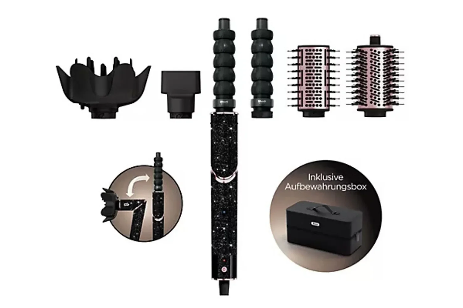Uključena kutija za pohranu održava red i tijekom putovanja, tako da možeš izvaditi željeni dodatak za stiliziranje kad god ti zatreba. U paketu također dobivaš praktični vodič za stiliziranje s savjetima, trikovima i inspiracijama – s kojima možeš stilizirati svoju kosu.