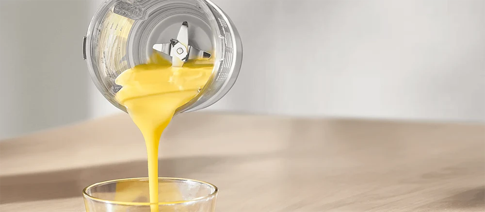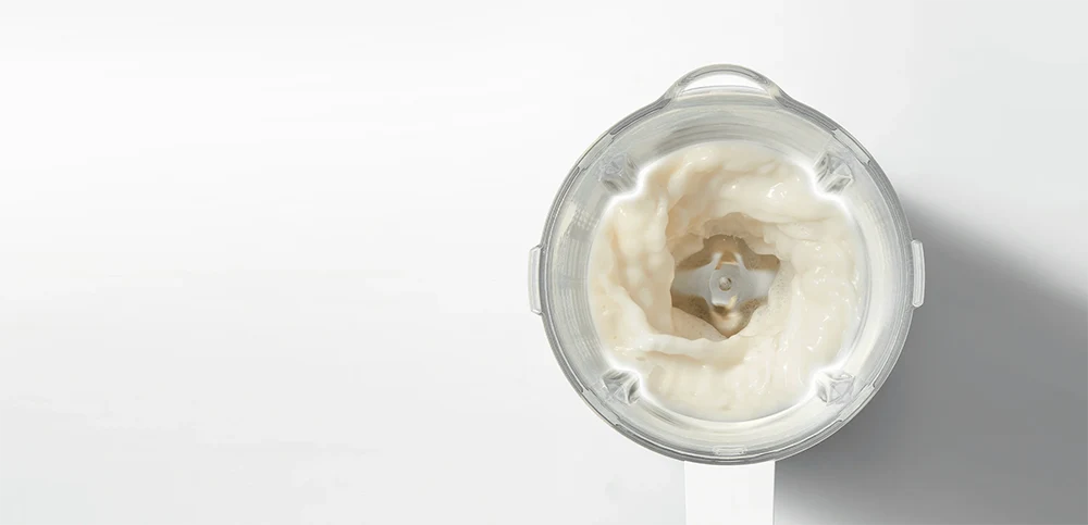 Opremljen motorom velike brzine koji pruža stabilnu izlaznu snagu, blender stvara efekt vrtloga za snažno miješanje. Šest oštrica od nehrđajućeg čelika i četiri podignute pregrade rade velikom brzinom kako bi postigli glatku i svilenkastu teksturu bez potrebe za filtriranjem. Jedinstveni dvostruki poklopac s mekim zatvaranjem osigurava tihi rad.